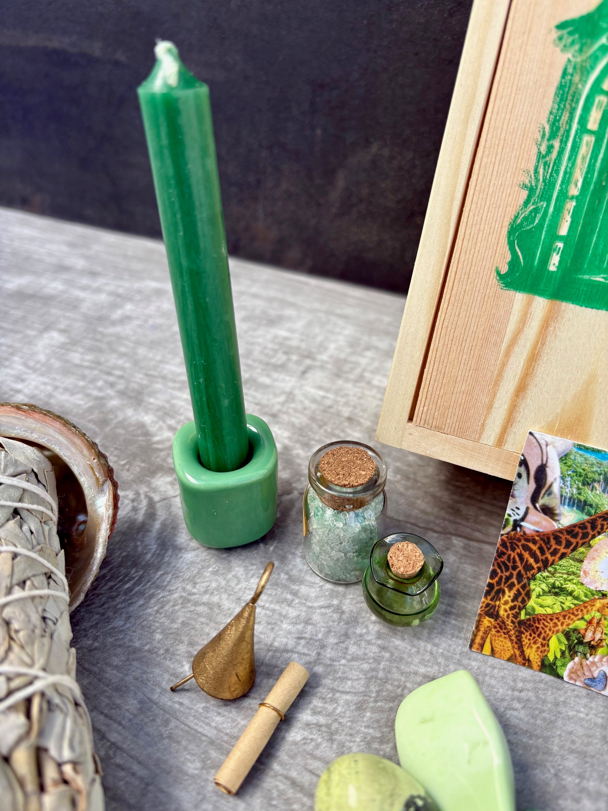 *Green altar candle, green candle holder
